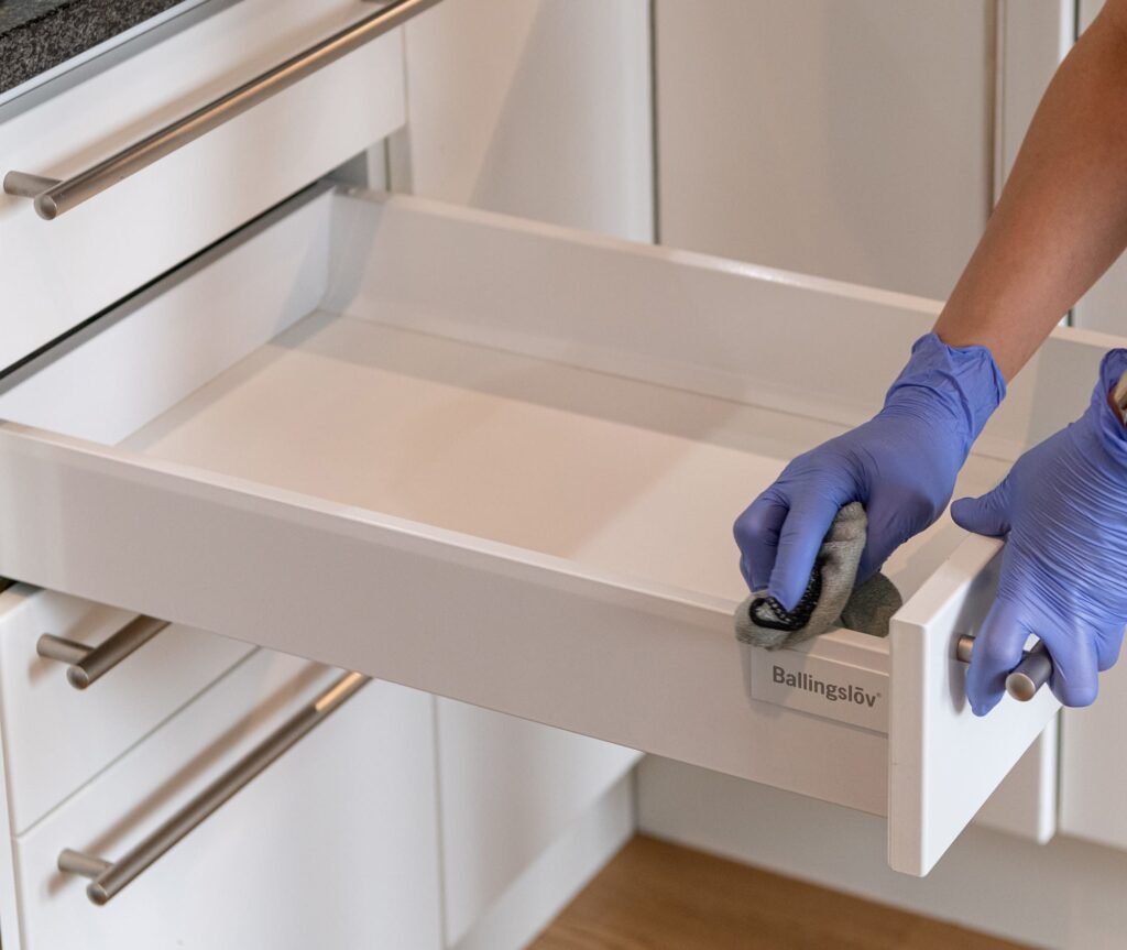 - Torkning av skåp, lådor och bänkar